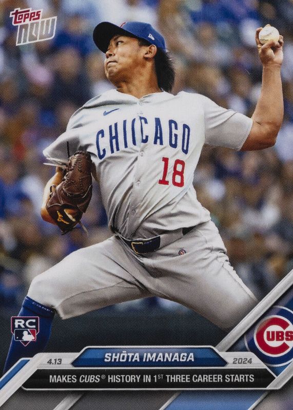 The Shota Imanaga 2024 Topps Now #72 Base (Print Run: 2,752) Rookie card in Raw condition has not changed in price in the last 30 days and was last sold for $20.00 .