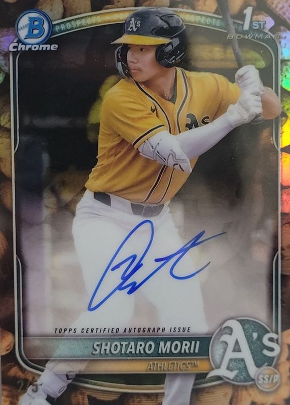 Best Prices Available For Sale of Shotaro Morii 2025 Bowman Chrome #CPA-SM Prospect Auto - Peanuts Refractor /5 (1st)