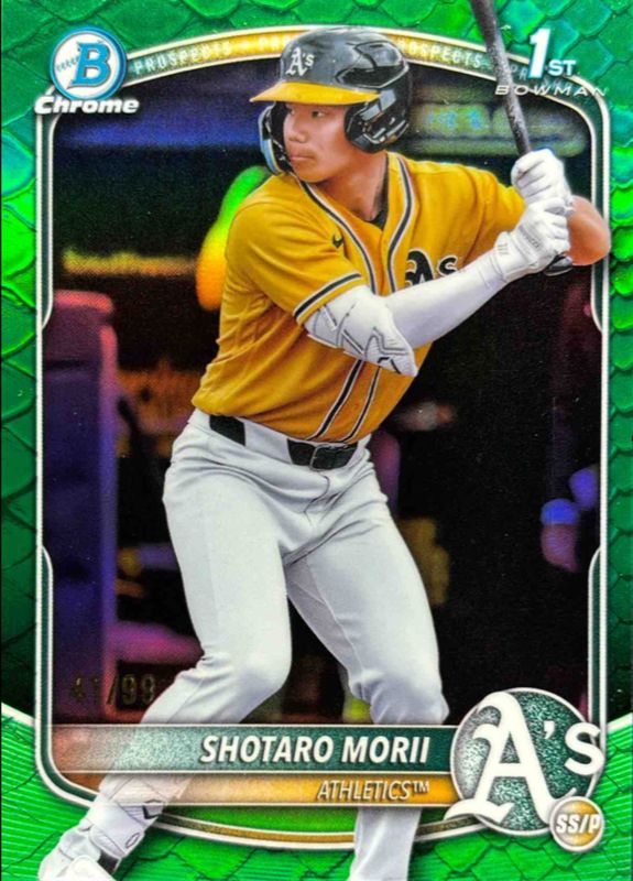 This card is 1 of 93 Shotaro Morii's card variations in the 2025 Bowman Chrome set being tracked by Sports Card Investor, including Base Image Variation, International Refractor Variation, Prospect Auto (1st), Prospect Auto - Black & White Shimmer Refractor (1st), and Prospects (1st).