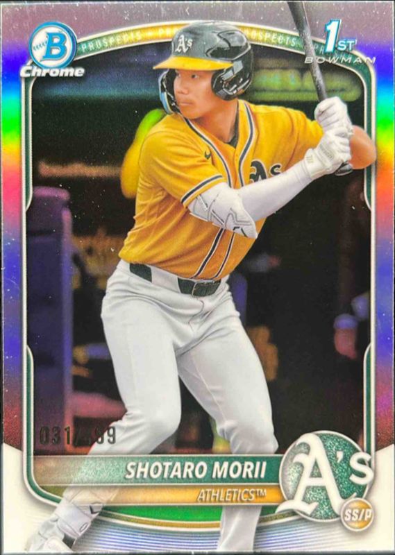 This card is 1 of 93 Shotaro Morii's card variations in the 2025 Bowman Chrome set being tracked by Sports Card Investor, including Base Image Variation, International Refractor Variation, Prospect Auto (1st), Prospect Auto - Black & White Shimmer Refractor (1st), and Prospects (1st).