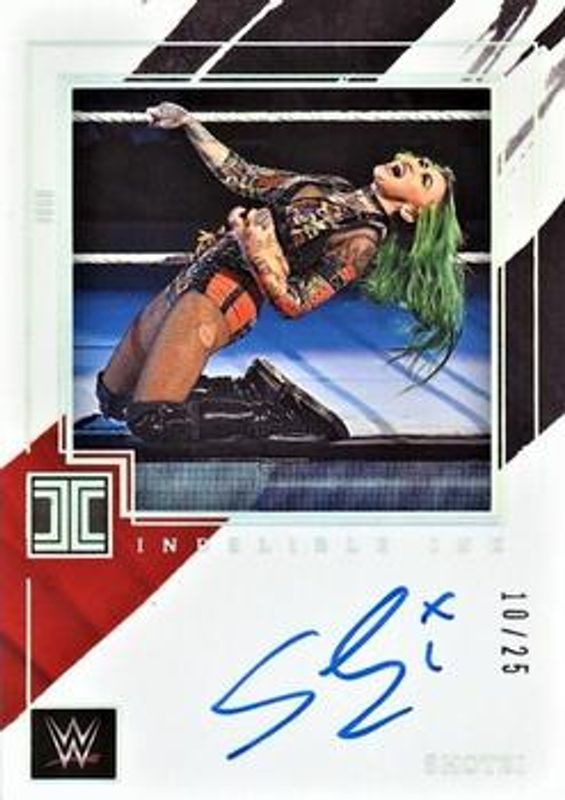 The Shotzi 2022 Impeccable WWE #IN-SHZ Indelible Ink - Holo Silver /25 card is 1 of 14 Shotzi's card variations in the 2022 Impeccable WWE set being tracked by Sports Card Investor, including Base /99, Silver /49, Gold /35, Holo Silver /25, and Holo Gold /10.