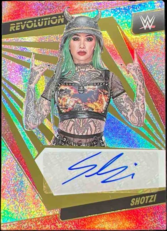 The Shotzi 2022 Revolution WWE #AG-SHZ Autographs card is 1 of 27 Shotzi's card variations in the 2022 Revolution WWE set being tracked by Sports Card Investor, including Base, Astro, Fractal, Galactic, and Groove.