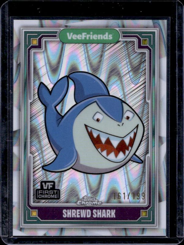 The Shrewd Shark 2025 Topps Chrome VeeFriends #67 RayWave Refractor /199 card is 1 of 27 Shrewd Shark's card variations in the 2025 Topps Chrome VeeFriends set being tracked by Sports Card Investor, including Base, Refractor, Yellow Refractor, Shimmer Refractor /250, and Wave Refractor /150.