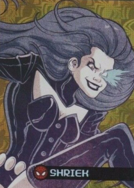 This card is 1 of 3 Shriek's card variations in the 2017 Fleer Ultra Spider-Man set being tracked by Sports Card Investor, including Royal Foil Pattern 1 /25, and Royal Foil Pattern 2 /10.