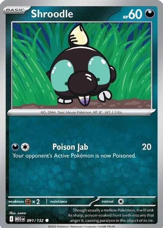 The Shroodle 2025 Mega Evolution #091/132 Reverse Holo card in Raw TCG (Lightly Played) condition has not changed in price in the last 30 days and was last sold for $0.99 .