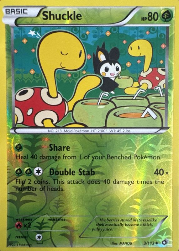 The Shuckle 2013 Black & White: Legendary Treasures #003/113 Reverse Holo card in Raw TCG (Near Mint) condition has not changed in price in the last 30 days and was last sold for $7.50 .