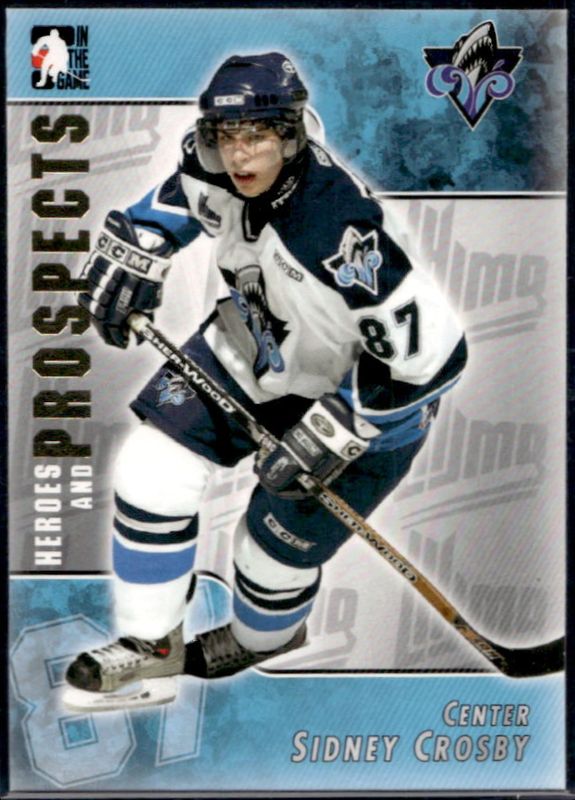 The Sidney Crosby 2004 In The Game Heroes & Prospects #104 Base card is 1 of 28 Sidney Crosby's card variations in the 2004 In The Game Heroes & Prospects set being tracked by Sports Card Investor, including #222 Base, #A-SC Autographs, #A-U-SC2 Autographs, #PCE-11 Complete Emblems, and #GUE-60 Emblems Gold.