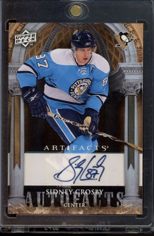 The Sidney Crosby 2009 Upper Deck Artifacts #AF-CR Autofacts card is 1 of 23 Sidney Crosby's card variations in the 2009 Upper Deck Artifacts set being tracked by Sports Card Investor, including #150 Base /699, #60 Base /699, #150 Silver /75, #60 Silver /75, and #60 Gold /50.
