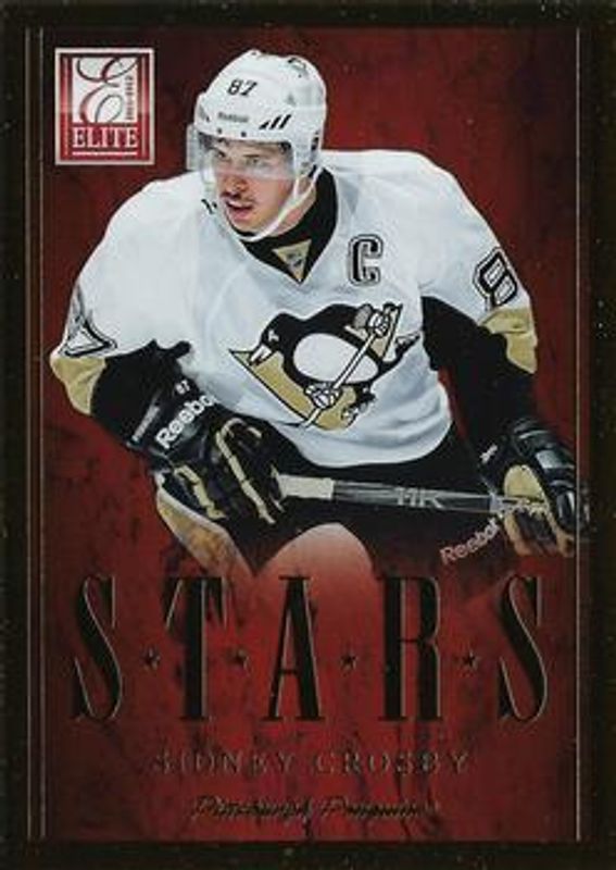 The Sidney Crosby 2011 Elite #10 Stars card is 1 of 18 Sidney Crosby's card variations in the 2011 Elite set being tracked by Sports Card Investor, including #167 Base /999, #167 Aspirations /99, #167 Gold Status die-cut /10, #2 Elite Series Sidney Crosby, and #3 Elite Series Sidney Crosby.