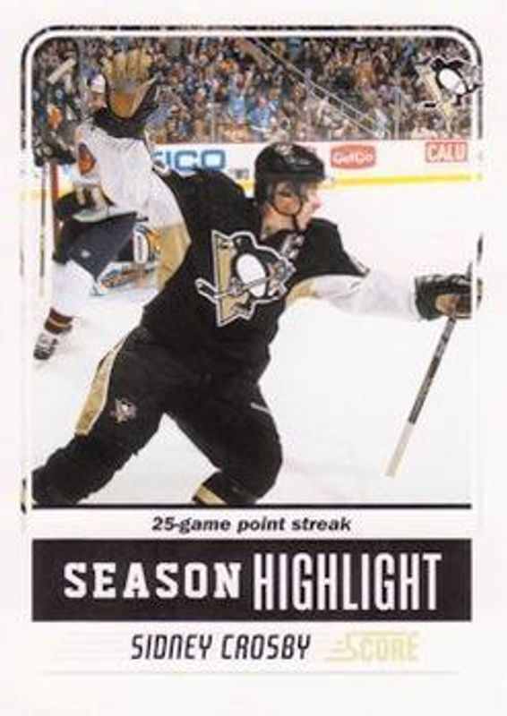 The Sidney Crosby 2011 Score #9 Glossy card is 1 of 14 Sidney Crosby's card variations in the 2011 Score set being tracked by Sports Card Investor, including #366 Base, #9 Base, #366 Black Ice, #9 Black Ice, and #366 Glossy.