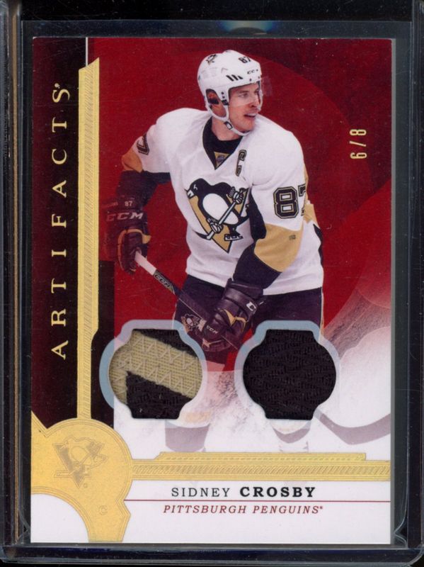 The Sidney Crosby 2016 Upper Deck Artifacts #125 Materials - Gold Spectrum /8 card is 1 of 15 Sidney Crosby's card variations in the 2016 Upper Deck Artifacts set being tracked by Sports Card Investor, including Base /499, Ruby /299, Emerald /99, Orange /55, and Gold Spectrum /25.