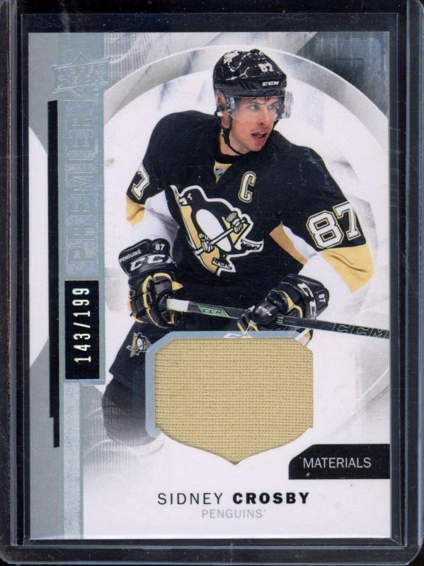 The Sidney Crosby 2016 Upper Deck Premier #1 Jersey /199 card is 1 of 23 Sidney Crosby's card variations in the 2016 Upper Deck Premier set being tracked by Sports Card Investor, including Base /299, Silver Spectrum Autographs /10, Neckline /6, Platinum Blue Spectrum Autographs /5, and Premium Materials /5.