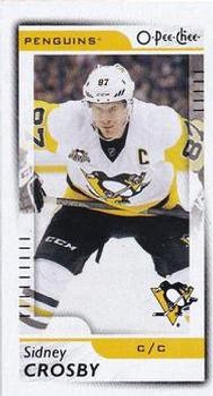 The Sidney Crosby 2017 O-Pee-Chee #M-70 Minis card is 1 of 29 Sidney Crosby's card variations in the 2017 O-Pee-Chee set being tracked by Sports Card Investor, including #551 Base, #301 Base, #593 Base, #593 Rainbow Foil, and #301 Rainbow Foil.
