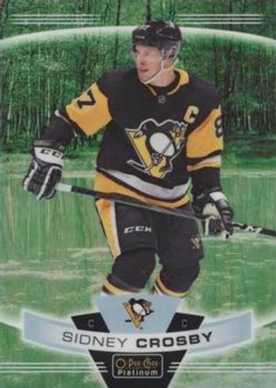 The Sidney Crosby 2019 O-Pee-Chee Platinum #1 Pond Hockey Green card is 1 of 30 Sidney Crosby's card variations in the 2019 O-Pee-Chee Platinum set being tracked by Sports Card Investor, including #1b Base, #1 Base, #1 Matte Pink, #1 Pond Hockey, and #1 Rainbow.