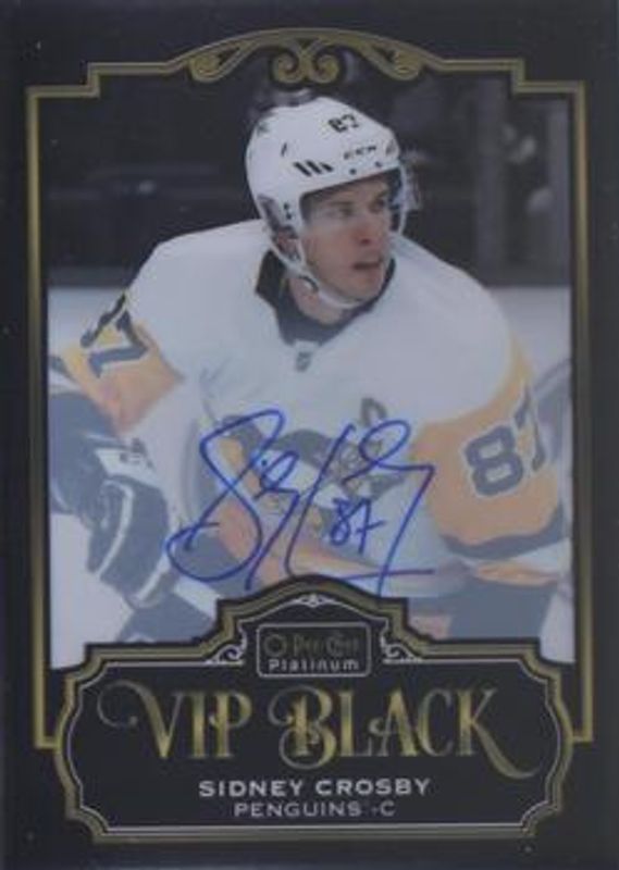 The Sidney Crosby 2019 O-Pee-Chee Platinum #VIP-27 VIP Black card is 1 of 30 Sidney Crosby's card variations in the 2019 O-Pee-Chee Platinum set being tracked by Sports Card Investor, including #1b Base, #1 Base, #1 Matte Pink, #1 Pond Hockey, and #1 Rainbow.