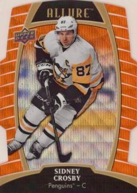 The Sidney Crosby 2019 Upper Deck Allure #36 Orange Slice /199 card is 1 of 27 Sidney Crosby's card variations in the 2019 Upper Deck Allure set being tracked by Sports Card Investor, including Base, Pewter, Red Rainbow, White Rainbow, and Yellow Taxi.