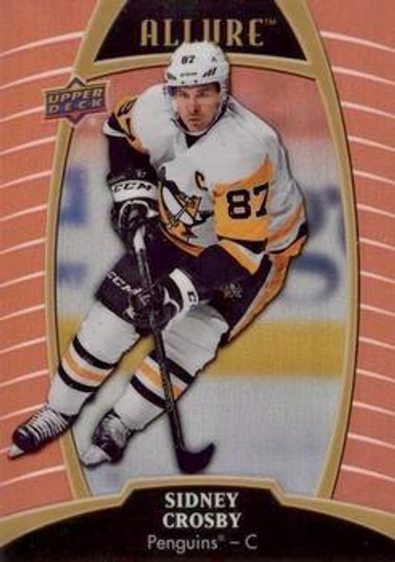 The Sidney Crosby 2019 Upper Deck Allure #36 Sunset card is 1 of 27 Sidney Crosby's card variations in the 2019 Upper Deck Allure set being tracked by Sports Card Investor, including Base, Pewter, Red Rainbow, White Rainbow, and Yellow Taxi.