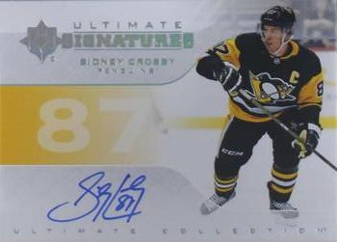 The Sidney Crosby 2020 Upper Deck Ultimate Collection #US-SC 2019 Upper Deck Ultimate Collection Update: Ultimate Signatures card is 1 of 23 Sidney Crosby's card variations in the 2020 Upper Deck Ultimate Collection set being tracked by Sports Card Investor, including Base /299, Autographs, Gold /35, Autographs Gold /15, and Jumbo Patch /15.