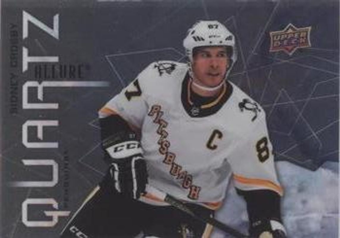 The Sidney Crosby 2021 Upper Deck Allure #AQ-SC Quartz card is 1 of 43 Sidney Crosby's card variations in the 2021 Upper Deck Allure set being tracked by Sports Card Investor, including Base, Black Rainbow, Blue China, Orange Slice die-cut, and Pink Blue Leopard.