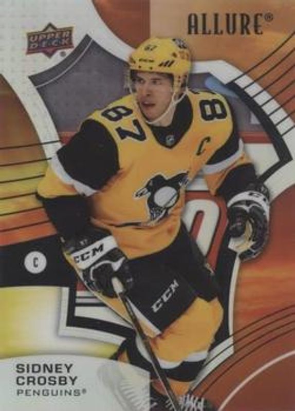The Sidney Crosby 2021 Upper Deck Allure #4 Sunrise card is 1 of 43 Sidney Crosby's card variations in the 2021 Upper Deck Allure set being tracked by Sports Card Investor, including Base, Black Rainbow, Blue China, Orange Slice die-cut, and Pink Blue Leopard.