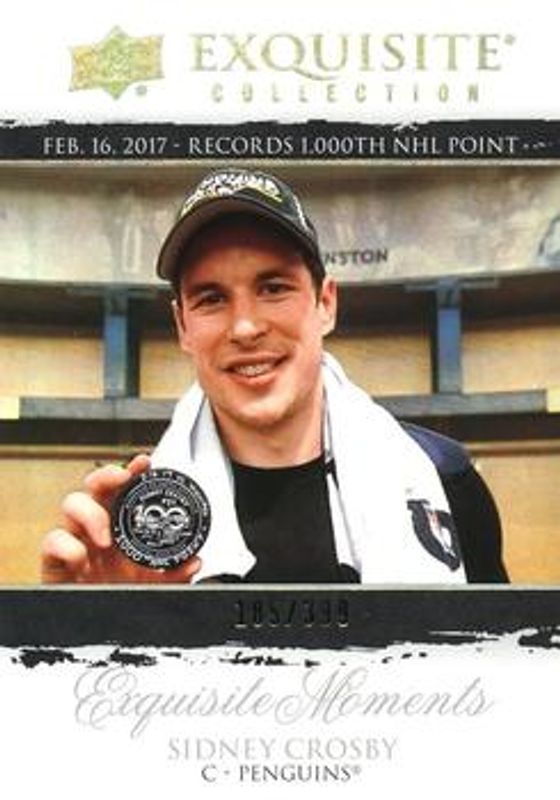 The Sidney Crosby 2021 Upper Deck Black Diamond #ECM-SC Exquisite Collection Moments /399 card is 1 of 26 Sidney Crosby's card variations in the 2021 Upper Deck Black Diamond set being tracked by Sports Card Investor, including Base /349, Premium Relics /50, Pure Black /50, Diamond Relics /5, and Diamond Relics Pure Black /1.