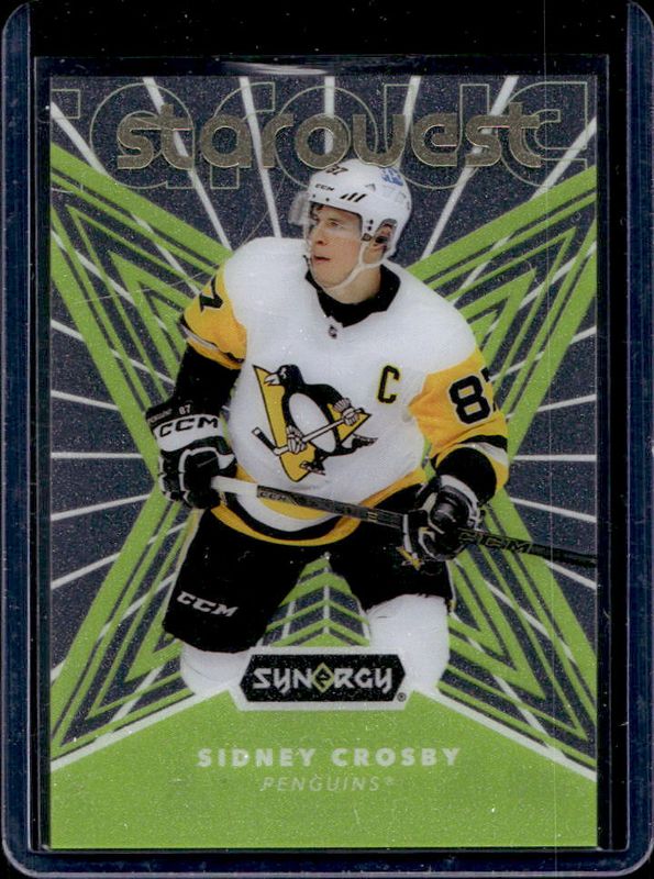 The Sidney Crosby 2024 Upper Deck Synergy #SQ-18 StarQuest Lime Green Tint card is 1 of 30 Sidney Crosby's card variations in the 2024 Upper Deck Synergy set being tracked by Sports Card Investor, including Base, Red Codes, Purple /49, Gold Bounty /25, and Red /25.