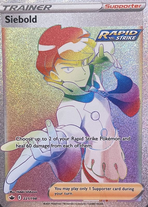 The Siebold 2021 Sword & Shield: Chilling Reign #221/198 Holo (Secret) card in Raw TCG (Near Mint) condition has moved up $5.42 (+117%) in the last 30 days and was last sold for $10.07 .