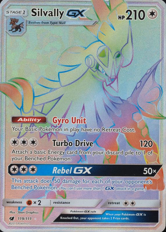 The Silvally GX 2017 Sun & Moon: Crimson Invasion #119/111 Holo (Secret) card in Raw TCG (Near Mint) condition has moved up $2.50 (+26.3%) in the last 30 days and was last sold for $11.99 .