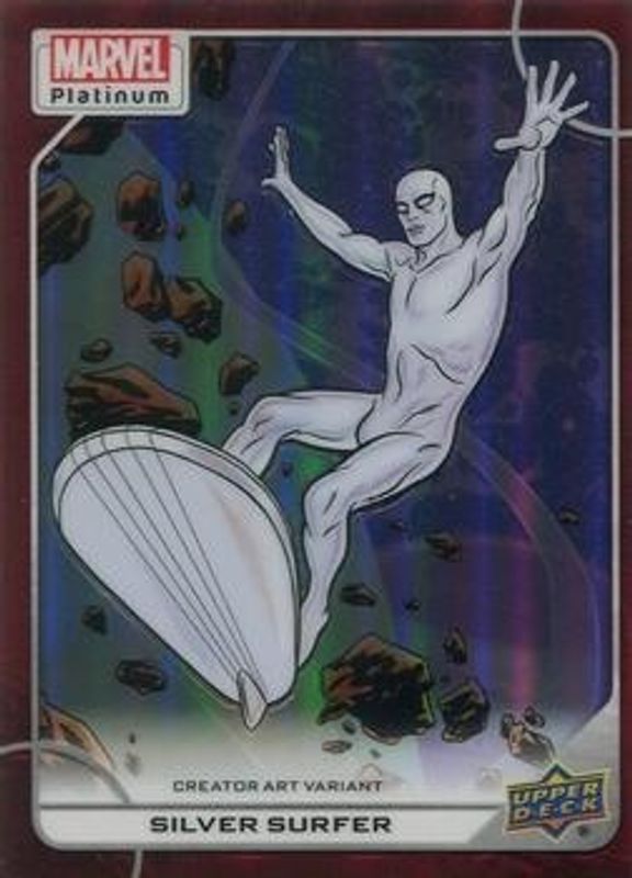 The Silver Surfer 2023 Upper Deck Marvel Platinum #93-V Creator Art Variant - Red Rainbow card is 1 of 57 Silver Surfer's card variations in the 2023 Upper Deck Marvel Platinum set being tracked by Sports Card Investor, including Base, Black Rainbow, Blue Rainbow, Blue Surge, and Purple Rainbow.
