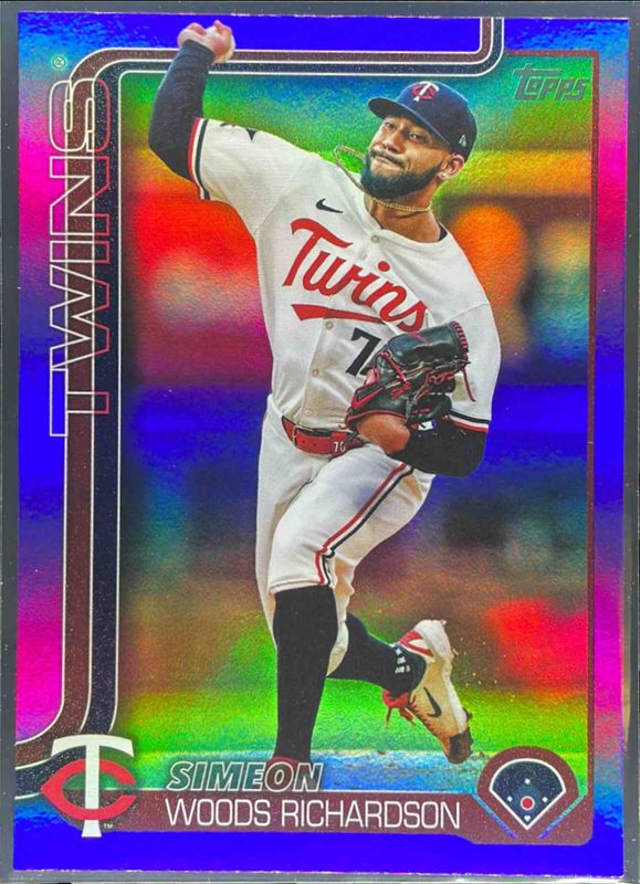 The Simeon Woods Richardson 2025 Topps #368 Purple Rainbow /250 card is 1 of 55 Simeon Woods Richardson's card variations in the 2025 Topps set being tracked by Sports Card Investor, including Base, Aqua Holo Foil, Diamante Foil, Holo Foil, and Pink Diamante Foil.