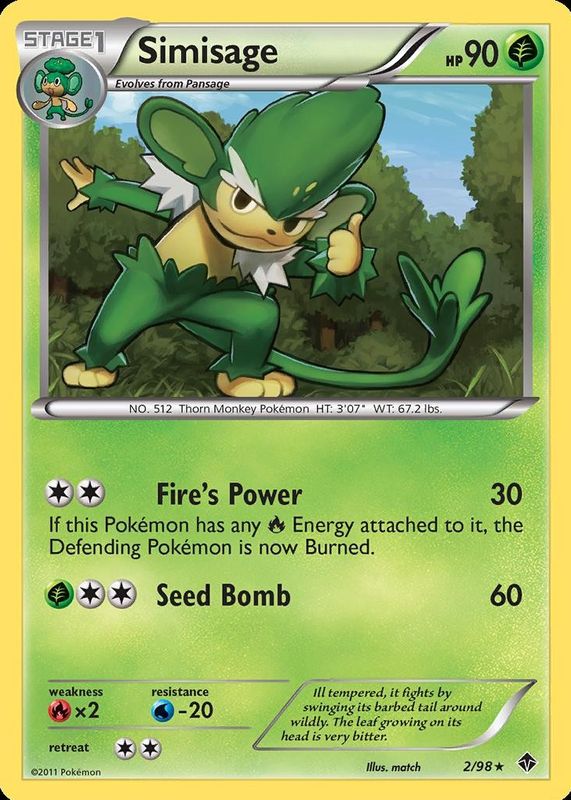 The Simisage 2011 Black & White: Emerging Powers #02/98 Reverse Holo card in Raw TCG (Near Mint) condition has not changed in price in the last 30 days and was last sold for $3.89 .