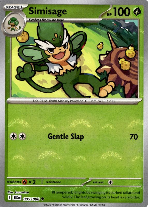 The Simisage 2025 Scarlet & Violet: Black Bolt #005/086 Poke Ball Reverse Holo card in Raw TCG (Near Mint) condition has moved down -$0.11 (-6.1%) in the last 30 days and was last sold for $1.68 .