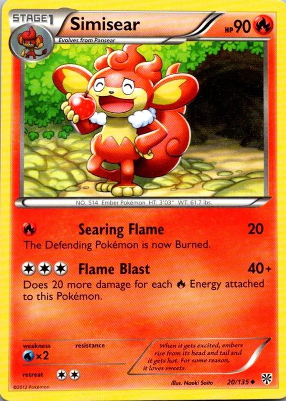 The Simisear 2013 Black & White: Plasma Storm #020/135 Base card in Raw TCG (Near Mint) condition has not changed in price in the last 30 days and was last sold for $1.10 .