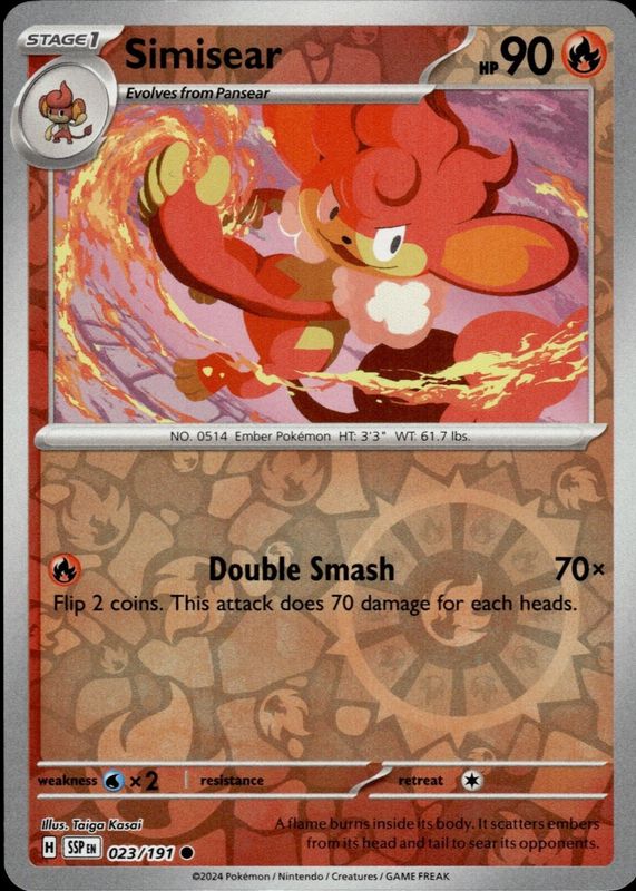 The Simisear 2024 Scarlet & Violet: Surging Sparks #023/191 Reverse Holo card in Raw TCG (Lightly Played) condition has not changed in price in the last 30 days and was last sold for $0.99 .