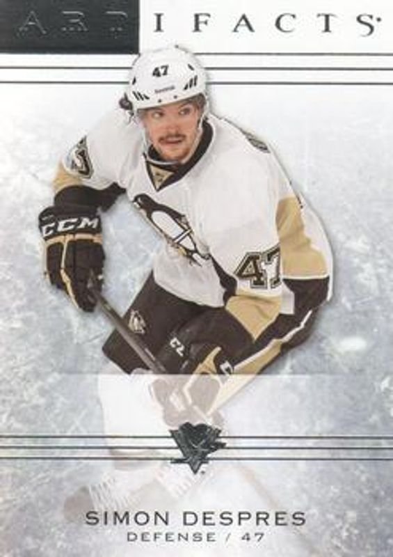 The Simon Despres 2014 Upper Deck Artifacts #44 Base /999 card is 1 of 11 Simon Despres' card variations in the 2014 Upper Deck Artifacts set being tracked by Sports Card Investor, including Ruby /499, Emerald /99, Sapphire /85, Gold Spectrum /25, and Black /5.