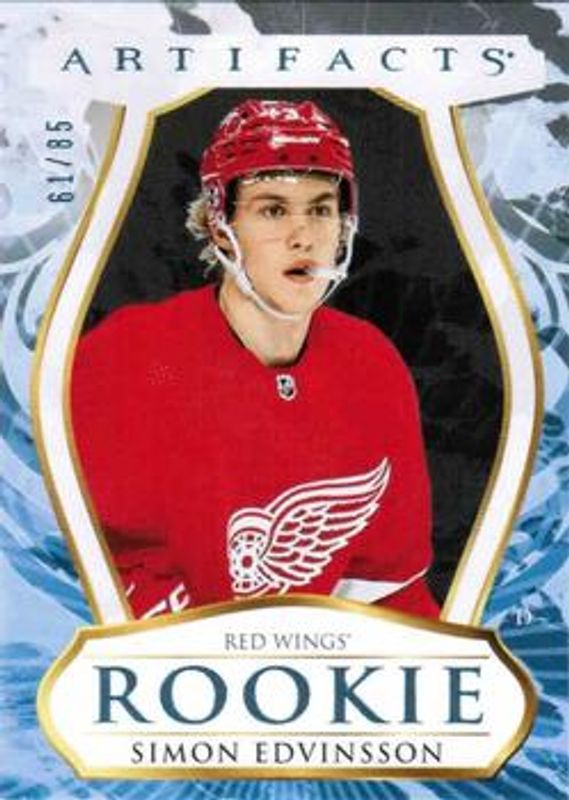 The Simon Edvinsson 2023 Upper Deck Artifacts #187 Light Blue Steel /85 Rookie card is 1 of 38 Simon Edvinsson's card variations in the 2023 Upper Deck Artifacts set being tracked by Sports Card Investor, including Base /999, Leather, Plexi, Turquoise, and Wood.