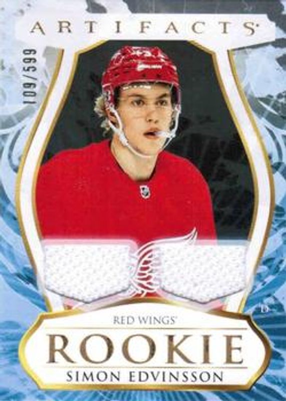 The Simon Edvinsson 2023 Upper Deck Artifacts #187 Material - Gold /199 Rookie card is 1 of 38 Simon Edvinsson's card variations in the 2023 Upper Deck Artifacts set being tracked by Sports Card Investor, including Base /999, Leather, Plexi, Turquoise, and Wood.