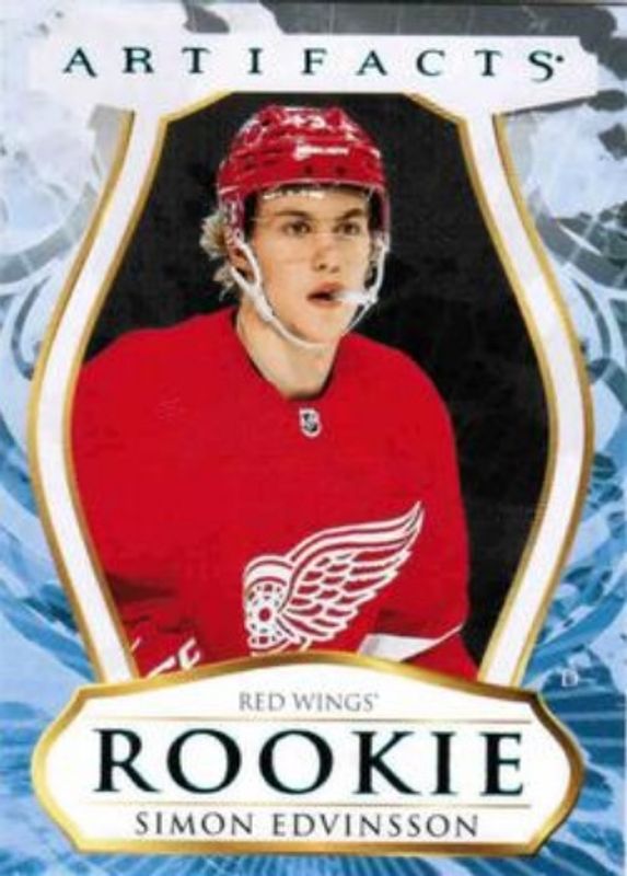 The Simon Edvinsson 2023 Upper Deck Artifacts #187 Turquoise Rookie card is 1 of 38 Simon Edvinsson's card variations in the 2023 Upper Deck Artifacts set being tracked by Sports Card Investor, including Base /999, Leather, Plexi, Wood, and Ruby /499.
