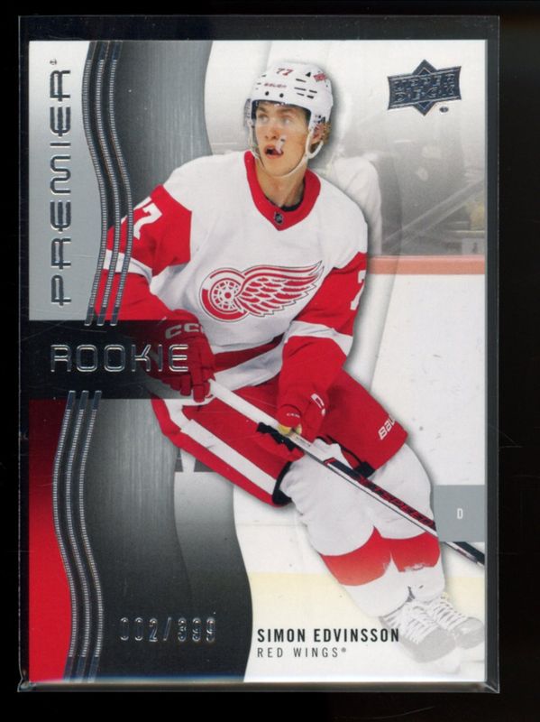 The Simon Edvinsson 2023 Upper Deck Premier #123 Base /399 Rookie card is 1 of 29 Simon Edvinsson's card variations in the 2023 Upper Deck Premier set being tracked by Sports Card Investor, including Bronze /199, Gold /65, Ruby /49, Rose Gold /25, and Fight Strap /15.