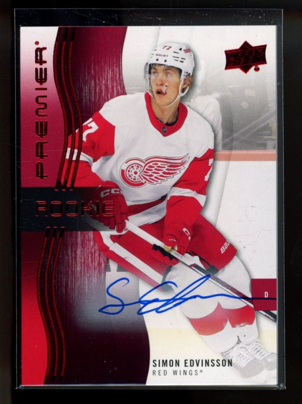 The Simon Edvinsson 2023 Upper Deck Premier #123 Base Auto Rookie card is 1 of 29 Simon Edvinsson's card variations in the 2023 Upper Deck Premier set being tracked by Sports Card Investor, including Base /399, Bronze /199, Gold /65, Ruby /49, and Rose Gold /25.