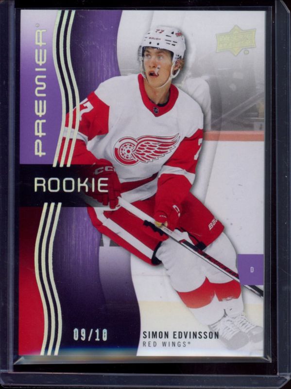 The Simon Edvinsson 2023 Upper Deck Premier #123 Purple /10 Rookie card is 1 of 29 Simon Edvinsson's card variations in the 2023 Upper Deck Premier set being tracked by Sports Card Investor, including Base /399, Bronze /199, Gold /65, Ruby /49, and Rose Gold /25.