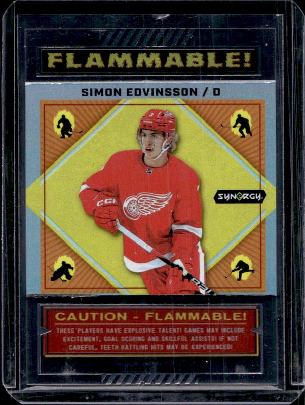 The Simon Edvinsson 2023 Upper Deck Synergy #FL-5 Flammable! Rookie card is 1 of 50 Simon Edvinsson's card variations in the 2023 Upper Deck Synergy set being tracked by Sports Card Investor, including Base /24, Red, Red Codes, Purple /99, and Gold /25.