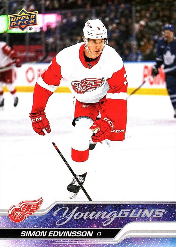 This card is 1 of 11 Simon Edvinsson's card variations in the 2023 Upper Deck set being tracked by Sports Card Investor, including Young Guns Base, Young Guns Canvas, Young Guns Canvas - Black & White, Young Guns - Clear Cut, and Young Guns - Outburst Silver.