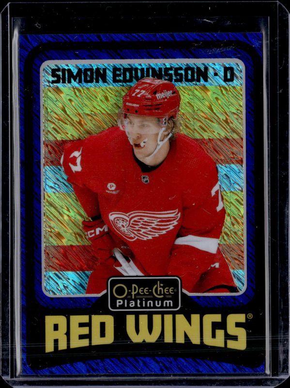 The Simon Edvinsson 2024 O-Pee-Chee Platinum #R40 Retro - Blue Luster /100 card is 1 of 19 Simon Edvinsson's card variations in the 2024 O-Pee-Chee Platinum set being tracked by Sports Card Investor, including 2023-24 Update Rookie Auto, 2023-24 Update Rookie Auto - Matte Pink, 2023-24 Update Rookie Auto - Rainbow, 2023-24 Update Rookie Auto - Sunset, and 2023-24 Update Sweet Selections Rainbow Auto.