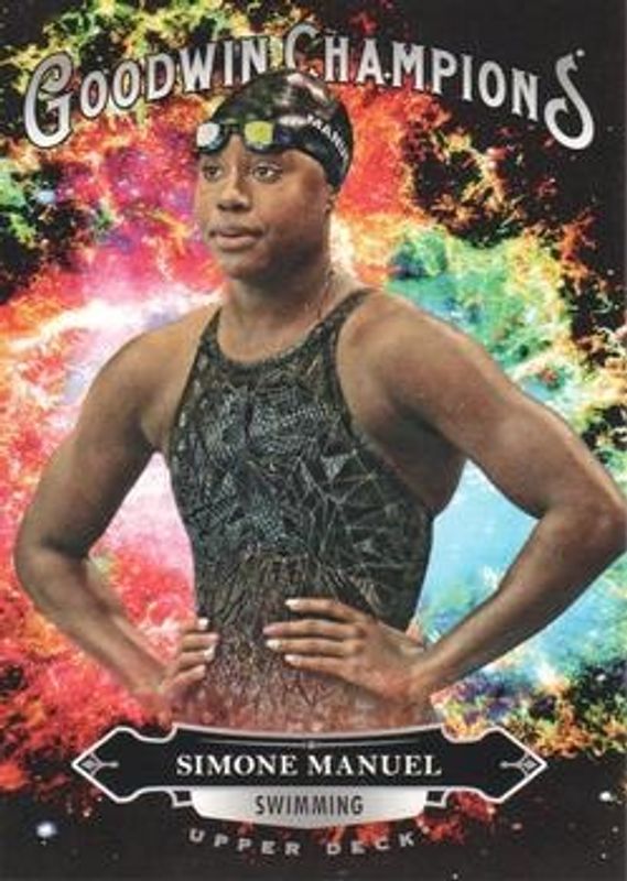 The Simone Manuel 2020 Upper Deck Goodwin Champions #117 Base card is 1 of 55 Simone Manuel's card variations in the 2020 Upper Deck Goodwin Champions set being tracked by Sports Card Investor, including #67 Base, #17 Base, #17 3 D Lenticular, #17 Black & White, and Blank Back.