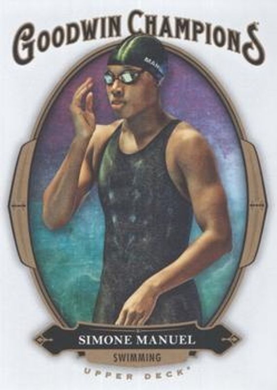 The Simone Manuel 2020 Upper Deck Goodwin Champions #17 Base card is 1 of 55 Simone Manuel's card variations in the 2020 Upper Deck Goodwin Champions set being tracked by Sports Card Investor, including #67 Base, #117 Base, #17 3 D Lenticular, #17 Black & White, and Blank Back.
