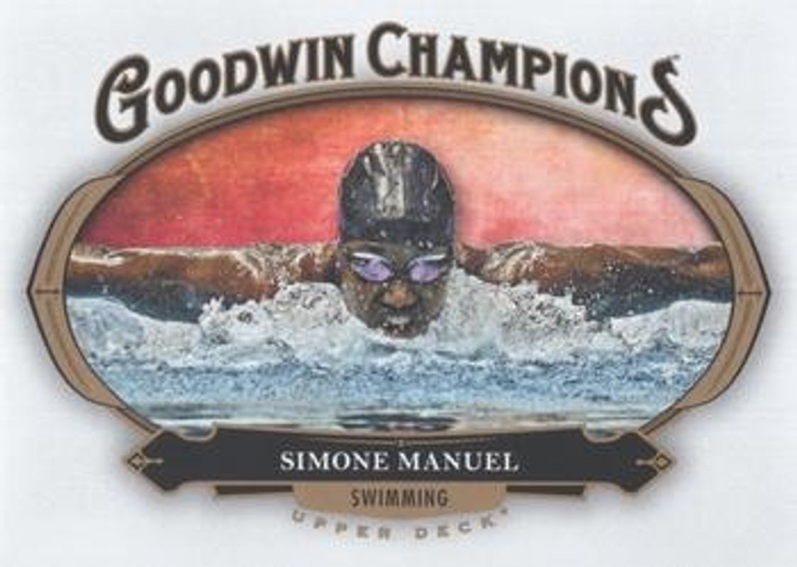 The Simone Manuel 2020 Upper Deck Goodwin Champions #67 Base card is 1 of 55 Simone Manuel's card variations in the 2020 Upper Deck Goodwin Champions set being tracked by Sports Card Investor, including #17 Base, #117 Base, #17 3 D Lenticular, #17 Black & White, and Blank Back.