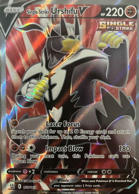 The Single Strike Urshifu V 2021 Sword & Shield: Battle Styles #150/163 Holo (Full Art) card in Raw TCG (Near Mint) condition has moved up $0.56 (+11.2%) in the last 30 days and was last sold for $5.54 .