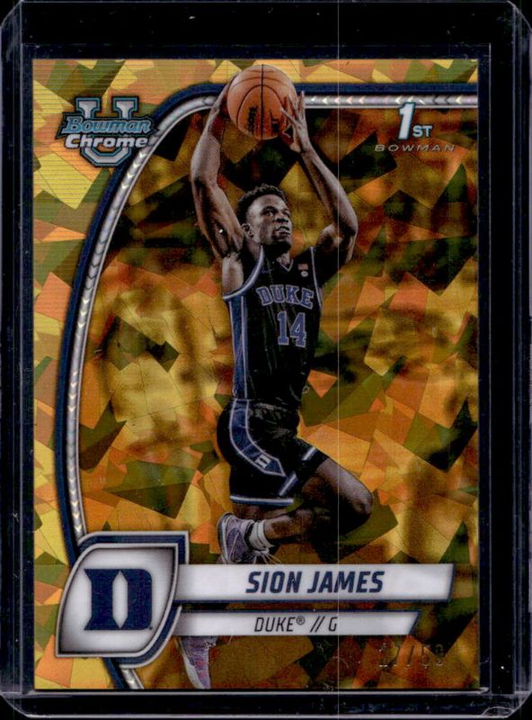 The Sion James 2024 Bowman Chrome University Sapphire Edition #63 Gold Refractor /50 card is 1 of 18 Sion James' card variations in the 2024 Bowman Chrome University Sapphire Edition set being tracked by Sports Card Investor, including Base, Purple Refractor /100, Yellow Refractor /75, Green Refractor /65, and Orange Refractor /25.