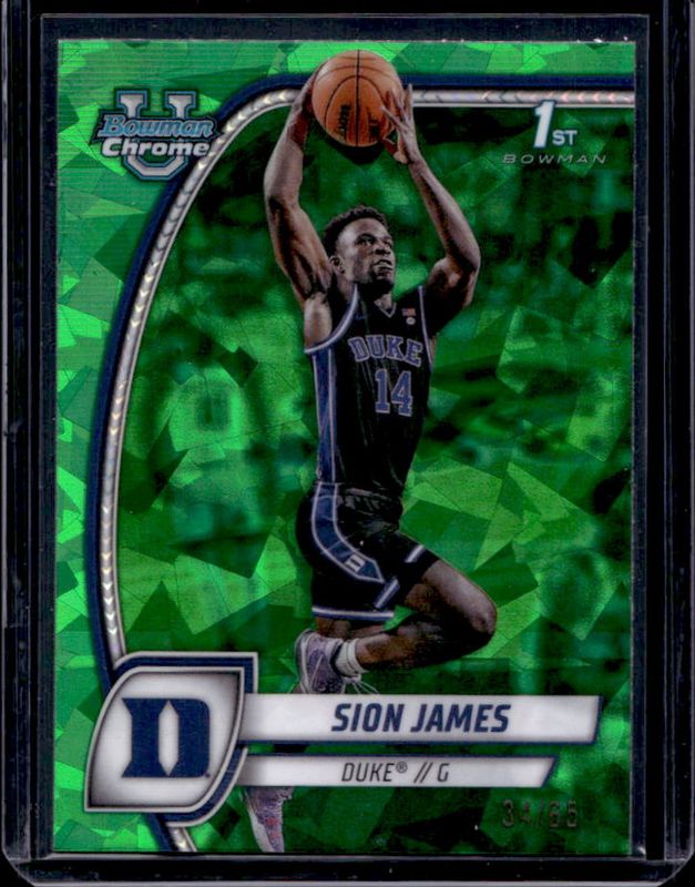 The Sion James 2024 Bowman Chrome University Sapphire Edition #63 Green Refractor /65 card is 1 of 18 Sion James' card variations in the 2024 Bowman Chrome University Sapphire Edition set being tracked by Sports Card Investor, including Base, Purple Refractor /100, Yellow Refractor /75, Gold Refractor /50, and Orange Refractor /25.